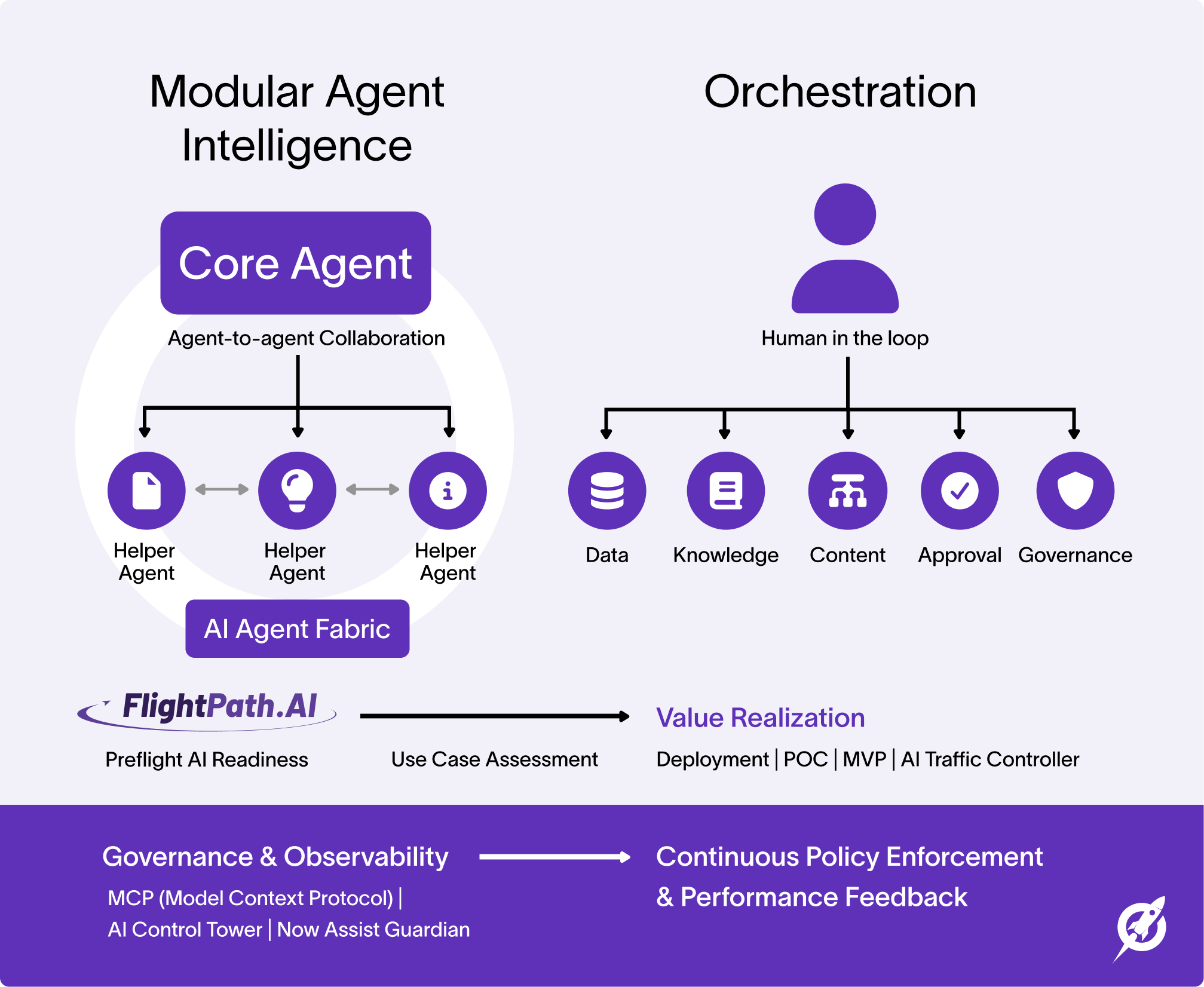 Every agent is equipped with the tools, skills, and prompt engineering it needs to excel - whether validating data, generating knowledge articles, personalizing content, or executing approvals. The result is a flexible, scalable orchestration model where agents collaborate seamlessly, adapt rapidly, and deliver measurable outcomes at speed.